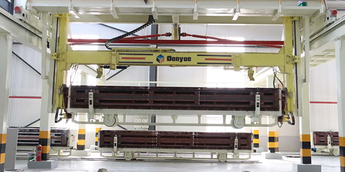 空翻脫模機用于抓取模箱翻轉 90°,側立在切割小車(chē)上進(jìn)行切割;由行走部分與吊具組成,吊具升降、開(kāi)鎖及翻轉均采用液壓驅動(dòng);模具開(kāi)鎖采用液壓缸直開(kāi)式結構,鎖緊臂旋轉 90°,具有開(kāi)合迅速穩定等特點(diǎn);模具抓鉤采用直抓式結構,具有液壓鎖定及機械自鎖,確保吊運的安全。
